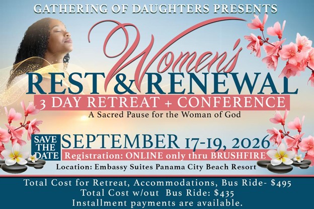 Hello Ladies, It is time to register for our Women’s Retreat and Conference in Panama City Beach, FL, taking place September 17–19, 2026. Please click on DETAILS to review all retreat information before registering. Click on REGISTER to submit your deposit or your full payment.
